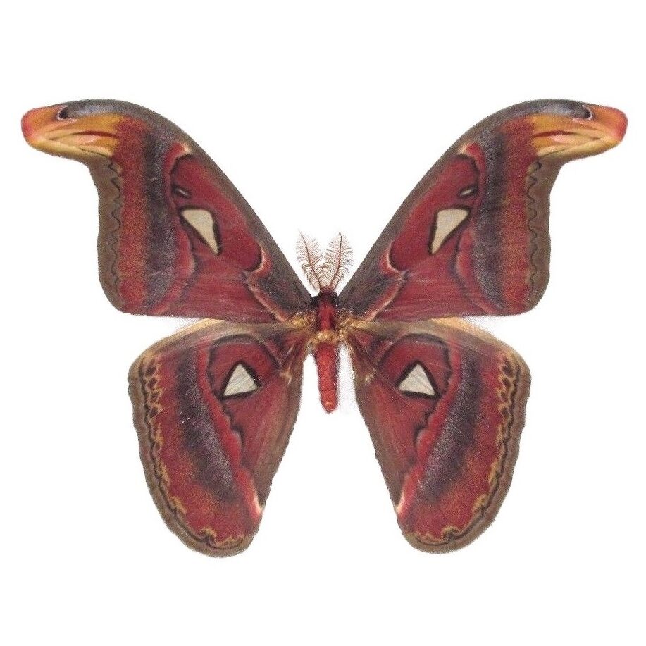 Also known as atlas moths, Attacus atlas are named after either Atlas, the Titan of Greek mythology or their map-like wing patterns. In Hong Kong, the Catonese name translates to “snake-head moth”, referring to the forewing tip, which resembles the head of a snake.
