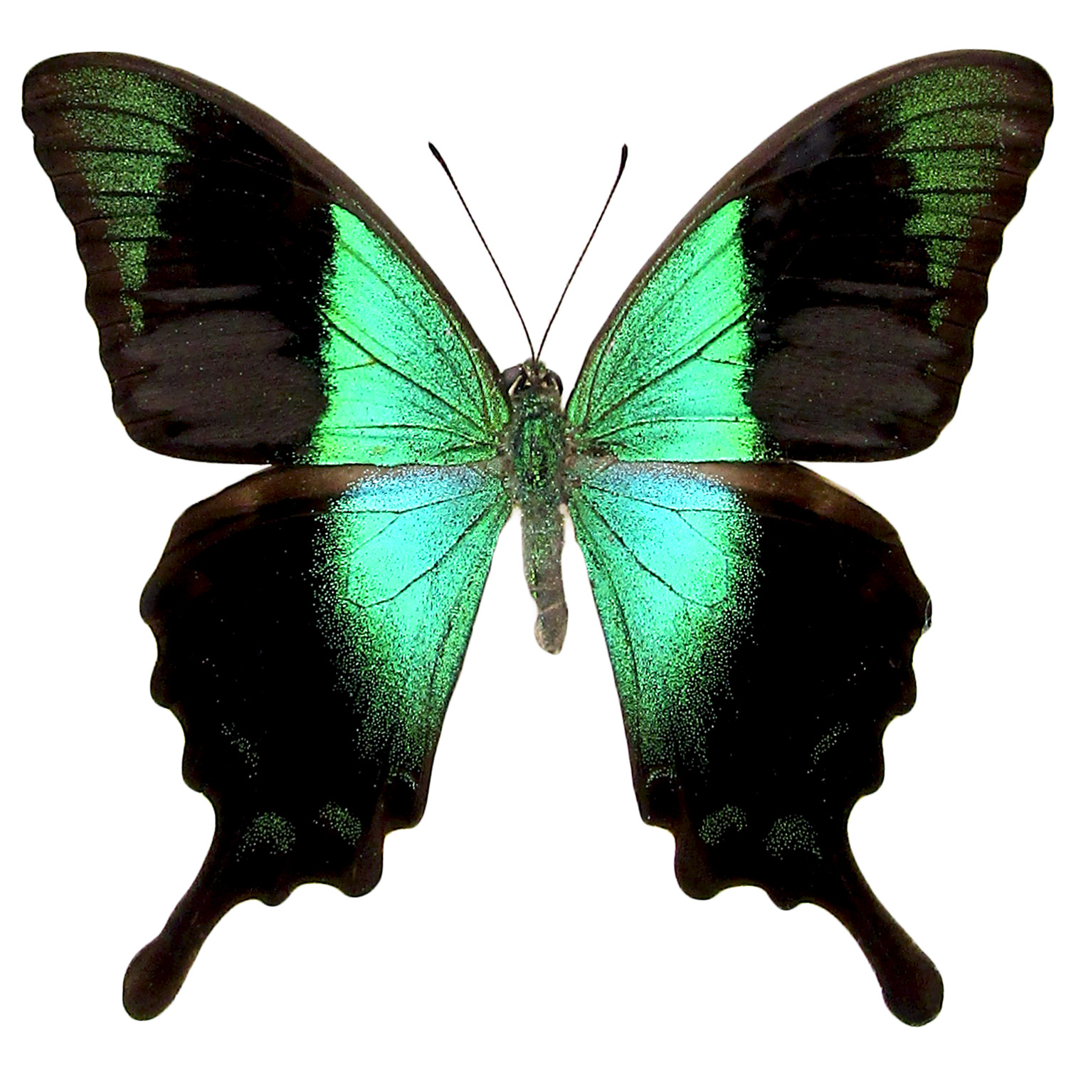 The iridescent green coloration is not produced by pigments, but is produced by the structure of the scales on the surface of the wing. They refract light and give us blue and yellow reflections, which is perceived by our eyes as being green.